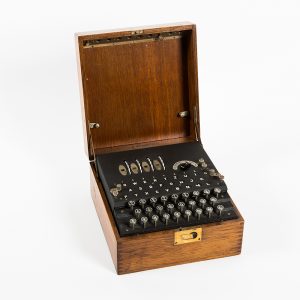 Also in this area is another exhibit which, although technically not part of two-way radios section, is certainly part of the history of the role played by radio communications during the Second World War. It is one of the most precious and interesting objects in the collection: the Enigma machine. The history of this technology is so broad, complex and interesting that it has inspired feature films, TV series, essays and novels; legends have been born around it and important figures have gravitated: one above all, the mathematician Alan Turing. With his work, Turing influenced the development of information technology so deeply that today he is considered one of his founding fathers.
